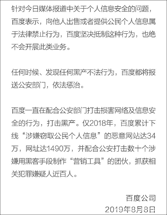 百度回應出售個人信息數據:違法行為,堅決抵制,絕不開展_風聞