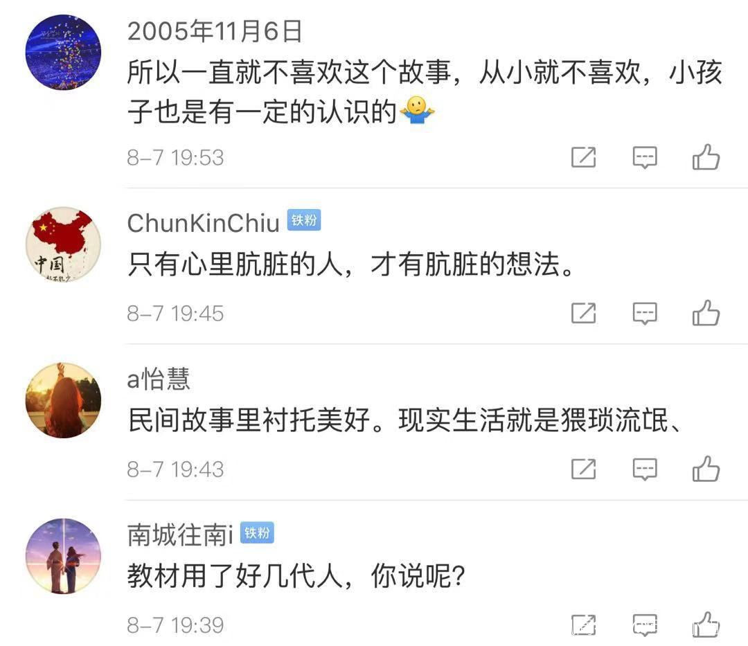 人民教育出版社編審陳先雲回應:“這是葉聖陶先生改編的民間故事”,“不要把很多猥瑣的東西,轉嫁到美好的愛情故事上。”網友表示