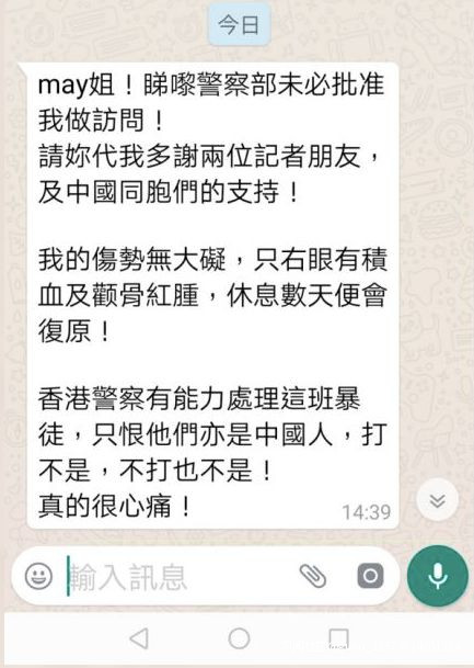 由於劉sir未獲批准接受採訪,事後他在與朋友的短信中向大家報平安:“休息數天便會復原!”同時他也痛心疾首表示:“只恨他們亦是中國人,打不是,不打也不是”。