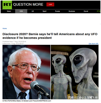 據“今日俄羅斯”(RT)報道,桑德斯7日表示,若他2020年成功當選美國總統,將不會隱瞞任何與UFO有關的信息。對此桑德斯還解釋稱,他妻子會“要求”他向美國民眾提供信息。