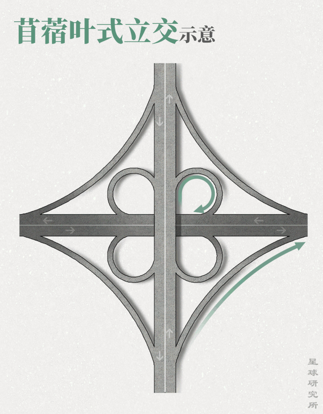(所有方向均實現連通的立交橋也被稱為全互通式立交;下圖為苜蓿葉式立交的通行示意,製圖@鄭伯容&陳思琦/星球研究所)