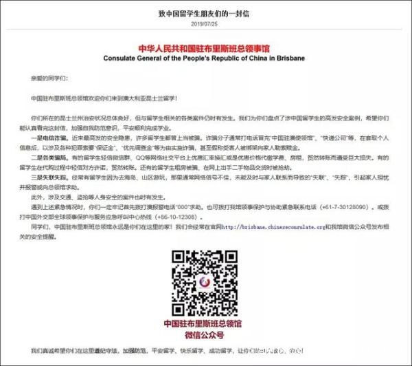 中國駐布里斯班總領館官網7月25日發佈《致中國留學生朋友們的一封信》。信中提醒同學們注意安全,加強自我防範意識,平安順利完成學業:“同學們,中國駐布里斯班總領館永遠是你們在這裏的家!”