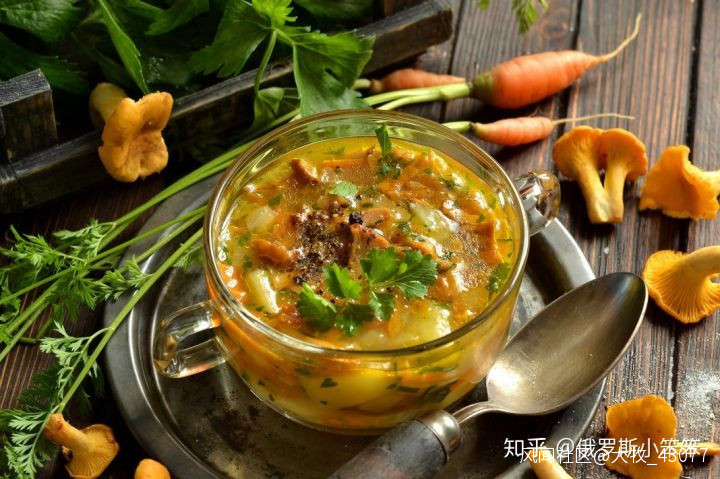 蘑菇湯,俄羅斯人非常喜歡去森林採蘑菇,並且拿他們煮湯。而這個蘑菇湯不是那麼的稠。裏面有肉湯,土豆,蘑菇和捲心菜,胡蘿蔔,洋葱。