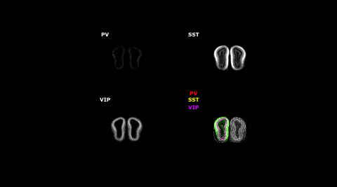 我們還可以對不同類型的神經元在不同腦區的分佈進行統計。這是三種神經元在小鼠不同剖面分佈的示意圖,這樣我們就可以非常直觀地看到,在不同腦區中,不同神經元的密度是不一樣的。