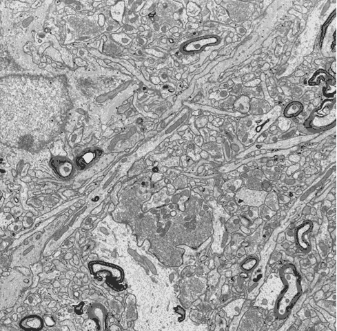 其次,利用電子顯微鏡等技術,也可以對納米尺度上腦的微觀結構進行研究,就像下方這幅圖上所展示的。