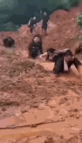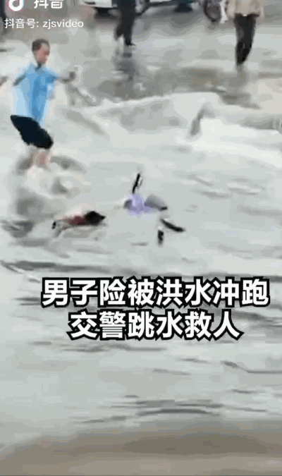 一名騎電動車的男子突然被馬路行洪的大水衝倒。
