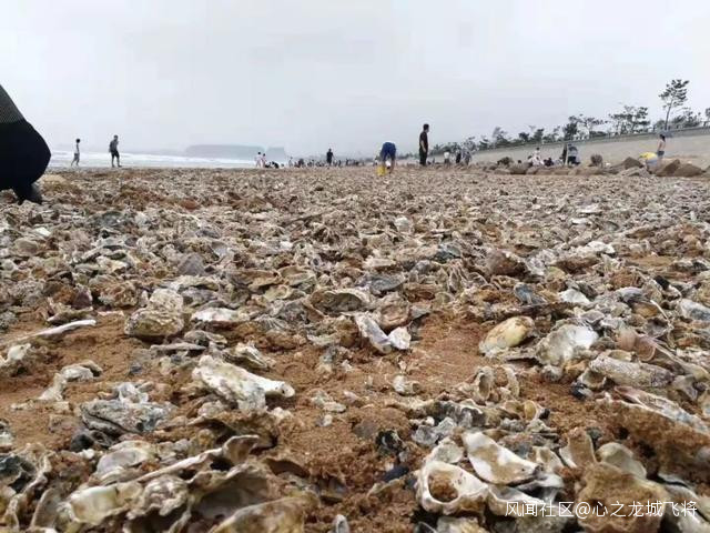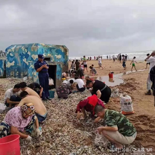 海灘上滿滿的全是在撿海蠣子的市民和遊客。