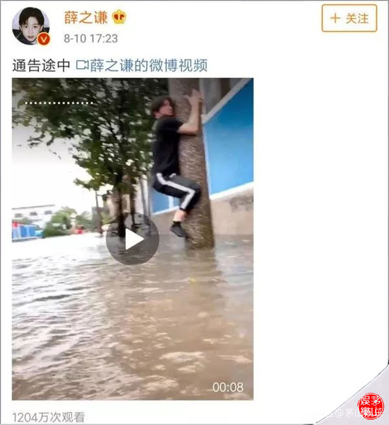 從中國共青團網官博的配圖不難看到,就在前一日薛之謙所曬的爬在電線杆的地方,再對比水退之後的真實現場圖片,不難發現,薛之謙當時拍視頻時,積水才沒過成人小腿肚,很明顯,薛之謙的這個視頻,不過是為了想借天災而人為製造點噱頭、看點,從而引起網友對其的關注。再則就是,稍微有點常識的人都知道,下雨天尤其還是路面嚴重積水的情況下,應該遠離電線杆,而不是爬上電線杆,他這是找死的節奏。