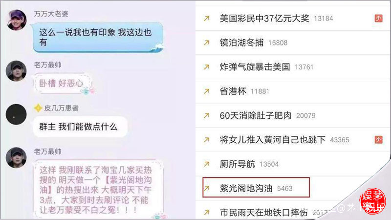 薛之謙粉絲的瘋狂舉動,不由得讓人想起1年多前,嘻哈歌手PGOne因被歌詞中存在大量負面因素,被紫光閣、共青團中央等權威機構點名批評。就因紫光閣連發三條微博,批評PGOne涉毒、音樂低俗、侮辱婦女。結果PGOne的腦殘粉絲誤以為紫光閣是一個飯店,於是他們花錢讓“紫光閣地溝油”衝上了微博熱搜,想用這種手段把這個飯店搞垮,於是,在微博搜索“紫光閣”,除了地溝油,還有“賣香爐”、“餐廳”等等。