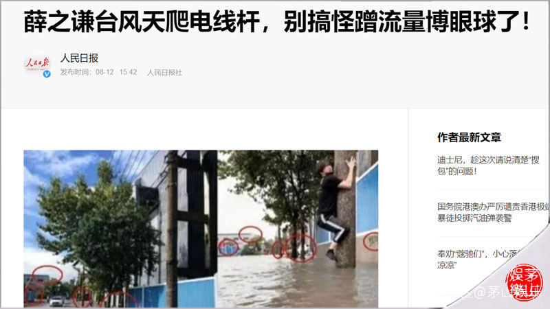 現在,連人民日報都看不下去了,親自發聲來點名批評薛之謙,説明什麼?説明薛之謙的不恰當行為把事搞大了,在全國多個省市的人民正在飽受洪災之害的關頭,薛之謙作為一個流量明星,不但不發揮自身的影響力,傳播正能量,反而是利用天災企圖蹭蹭流量博博眼球,他的行為不光無腦,還很愚蠢。當事人薛之謙在刪除了視頻後,轉發人民日報的微博並配文道:“昏睡9小時半夜醒來,才看到臨海台風洪災。”