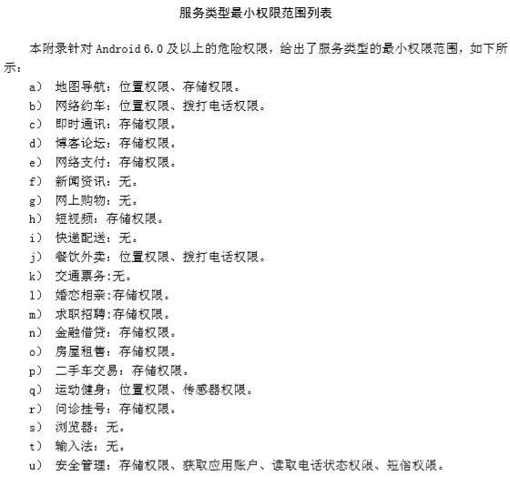 另外針對安卓6.0系統及以上的危險權限,草案也給出了各種服務類型的最小權限範圍,如網絡約車有位置權限、撥打電話權限;新聞資訊和網上購物則無權限;短視頻有存儲權限;運動健身有位置權限何傳感器權限;安全管理則有存儲權限、獲取應用賬户、讀取電話狀態權限、短信權限等。