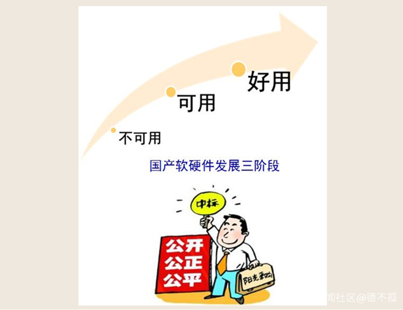 我們國產桌面計算機體系對WIntel體系的替代,採取了“1+3”技術架構,操作系統是Linux,中國產的CPU可包含4類國產芯片——申威、飛騰或海思以及龍芯。實際上,微軟的Windows只可支持Intel和AMD兩種芯片。從這裏也看出,缺心(芯)少魂(操作系統)中,操作系統似乎更重要。要替代Wintel系統,一定要有特殊做法。首先政府部門自己用,用得好了,推廣到重要領域,比如説銀行、能源、交通、通訊等等領域,最後慢慢推廣到老百姓,可以分階段實施。