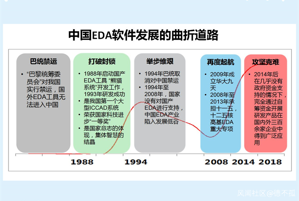 以EDA軟件為例,大家已知道網信領域短板中的短板是EDA,即電子自動化設計軟件,我國基本上沒有,都從外國購買。新中國剛成立時,“巴黎統籌委員會”對我們實行禁運,國外EDA工具無法進入中國;1988年,中國啓動了國產EDA工具叫“熊貓系統”開發工作,1993年研發出了我國第一個大型ICCAD系統,獲得國家科技進步獎一等獎,這是國家意志的體現;1994年,巴統取消對中國的禁運,從1994年到2008年,國家就不再對國產EDA進行支持,中國EDA產業陷入發展低谷;歷經了“巴統禁運-打破封鎖-舉步維艱”三個階段後,2009年我國再度起航,2009年成立了華大九天,在2008年到2013年承擔國家十一五、十二五核高基EDA重大專項。2014年後在幾乎沒有政府資金支持的情況下,華大九天完全通過自籌資金開展研發,從上述我國EDA軟件曲折的發展歷程可以看到,能否堅持自主創新、自主可控的道路,對關鍵核心技術的發展起決定的作用。