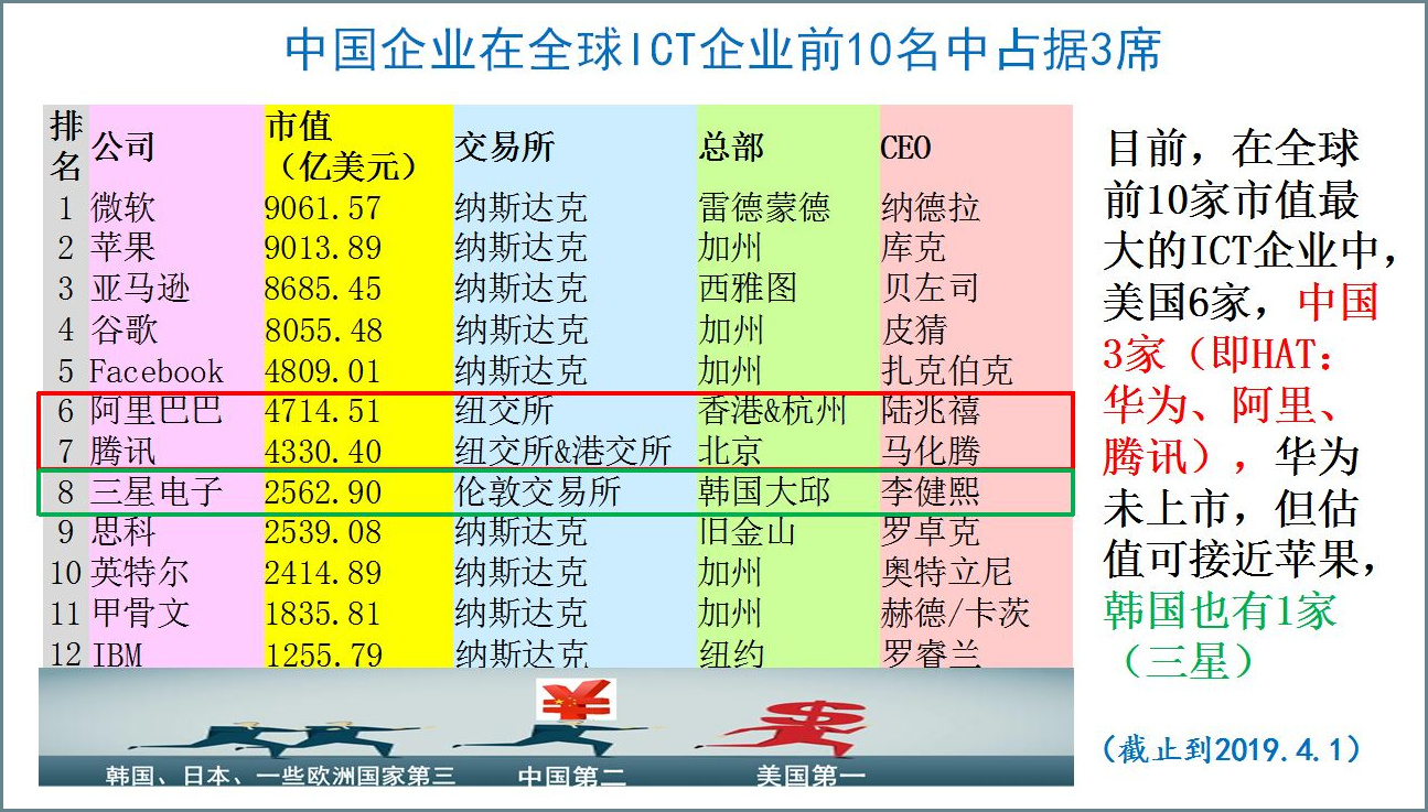中國企業在全球ICT企業中前十名中佔據3席(來自演講PPT)