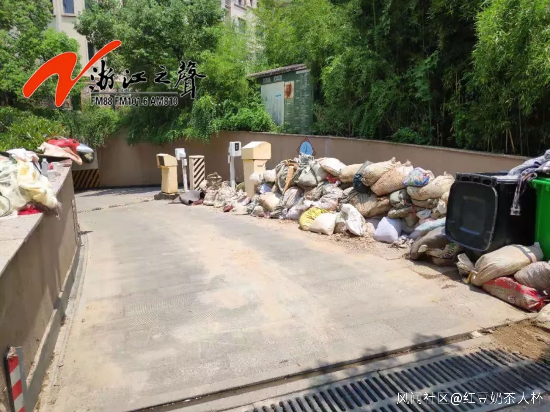 上午,豔陽高照,在湖畔尚城小區地下車庫東門,不時有車輛駛進或駛出地下車庫。一旁,一大堆沙包、被子、廣告牌提醒着來往的業主,一場內澇剛剛退去。