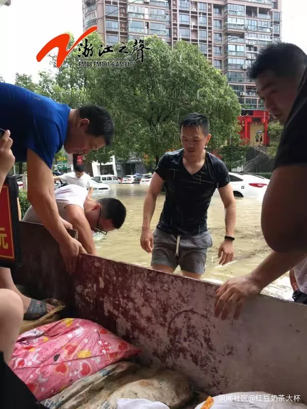 有人在一線防洪,就有人負責後勤。很多業主送來礦泉水、薑茶還有吃的。就這樣,大家一直守到凌晨兩點多,看到水位慢慢下降,坐在辛苦了一夜堆成的堤壩上,所有人都鬆了一口氣,小區保住了。