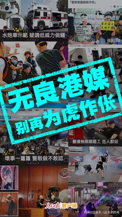 人民日報在8月13日發表鋭評文章《無良港媒,別再為虎作倀!》指出,及時、全面、如實報道是媒體的生命線,持平、專業、客觀是新聞人最基本的職業素養;但是現今不少港媒,其興風作浪、煽風點火的本事令人“歎為觀止”,這樣的媒體是毫無公信力可言的。