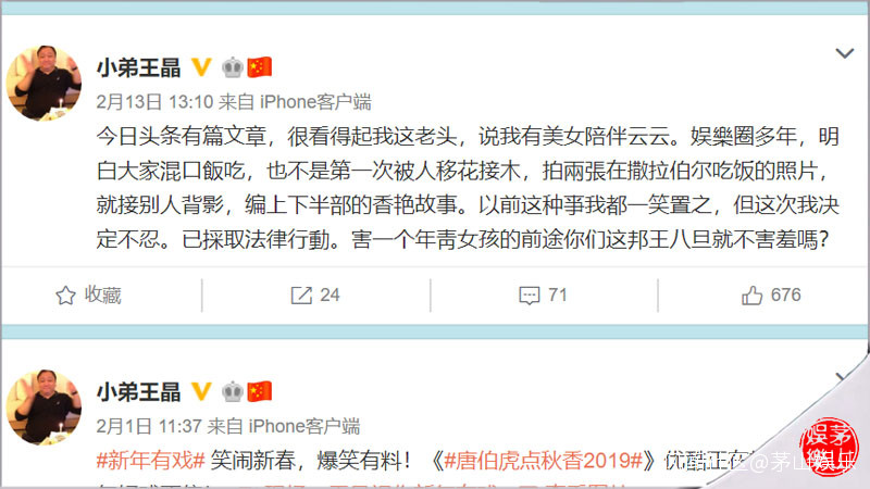 縱觀近些年對王晶的報道,不是説他又拍了什麼爛片,就是大寫特寫他的私生活如何混亂。當然,對於被八卦媒體指其私生活混亂這點上,王晶本人是不承認的,今年情人節前一天,他曾在微博上怒斥有人“移花接木,拍兩張在撒拉伯爾吃飯的照片,就接別人背影,編上下半部的香豔故事。”他還表示,寫文章的人“很看得起我這老頭,説我有美女陪伴云云”,但為了“一個年靑女孩的前途”決定採取法律行動。
