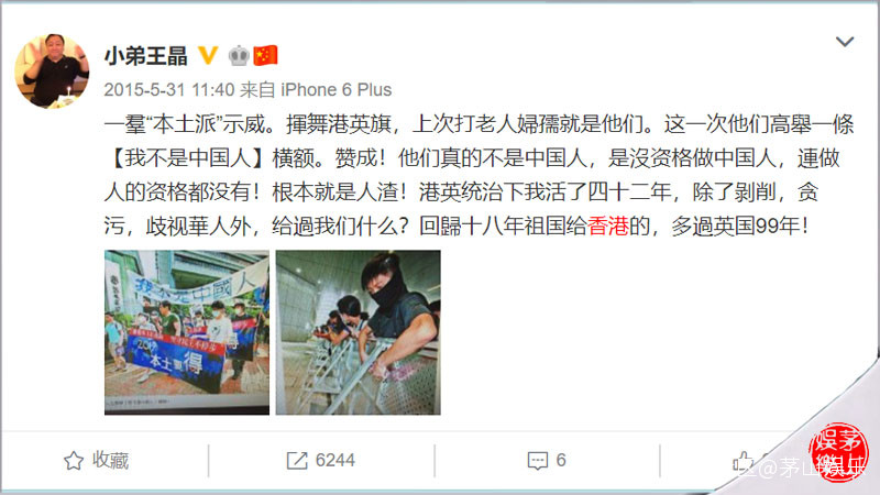 儘管私生活飽受詬病,但導演王晶有一點非常值得稱頌,那就是他的家國情懷。他2014至2015年,他就曾多次在微博上發聲,怒斥香港的某些漢奸、賣國賊。他曾表示那些:“高舉一條【我不是中國人】橫額。贊成!他們真的不是中國人,是沒資格做中國人,連做人的資格都沒有!根本就是人渣!港英統治下我活了四十二年,除了剝削,貪污,歧視華人外,給過我們什麼?迴歸十八年祖國給香港的,多過英國99年!”