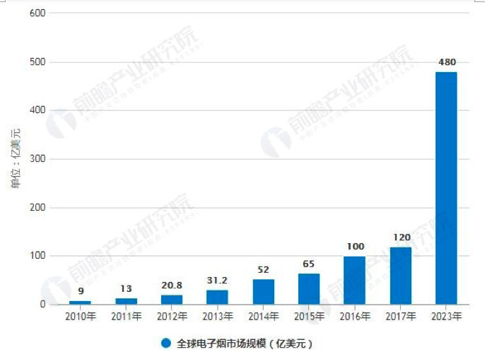 根據《2017年世界煙草發展報告》數據,全球電子煙市場規模達到120億美元,其中海外市場佔比94%;預測到2023年全球電子煙有望達到480億美元的市場規模,年均複合增速達到26%。當前,中國電子煙滲透率不到1%,但我國煙民基數大,國內電子煙市場發展潛力巨大;假設未來電子煙的滲透率達到10%,相應市場規模能夠達到千億級別。