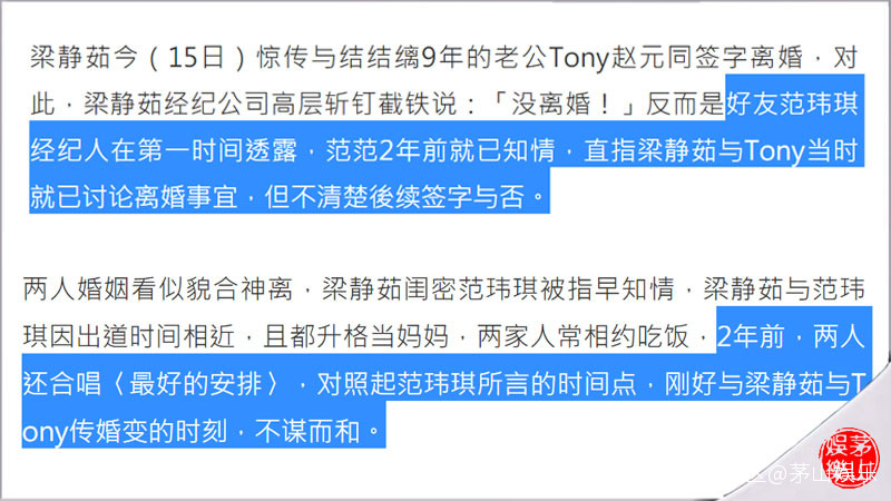 然而,令梁靜茹沒想到的是,她這邊正堅決否認離婚傳聞時,卻被好閨蜜范瑋琪補了一刀。台媒稱,“范瑋琪經紀人在第一時間透露,範範2年前就已知情,直指梁靜茹與Tony當時就已討論離婚事宜,但不清楚後續簽字與否。”台媒還稱“2年前,兩人還合唱〈最好的安排〉,對照起范瑋琪所言的時間點,剛好與梁靜茹與Tony傳婚變的時刻,不謀而和。”