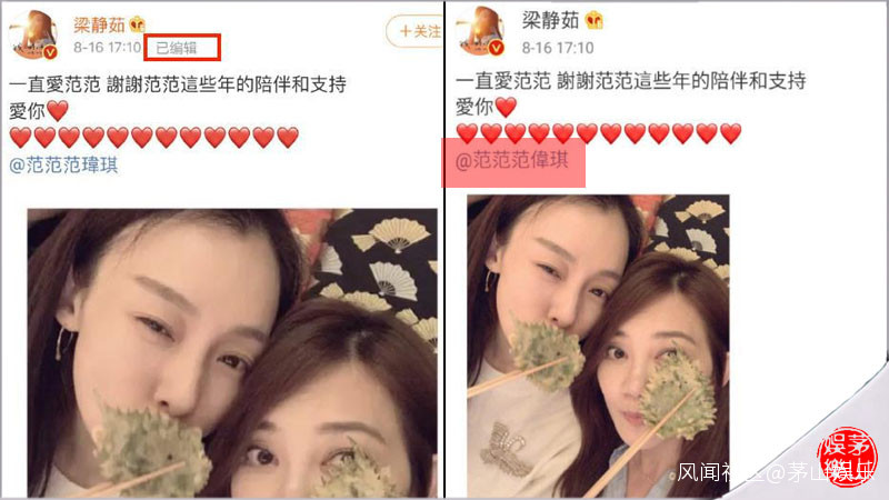 然而,另所有人意外的是,梁靜茹於16日下午17:10分發微博稱“一直愛範範,謝謝範範這些年的陪伴和支持,愛你”並曬出了二人的親密合影,以此來闢謠被好閨蜜、好姐妹范瑋琪插刀,想以此來打破好姐妹不合的傳聞。但是尷尬的是,梁靜茹在發表白文的時候居然艾特錯了范瑋琪的名字,把“范瑋琪”寫成了“範偉琪”,從而被網友吐槽是塑料姐妹。