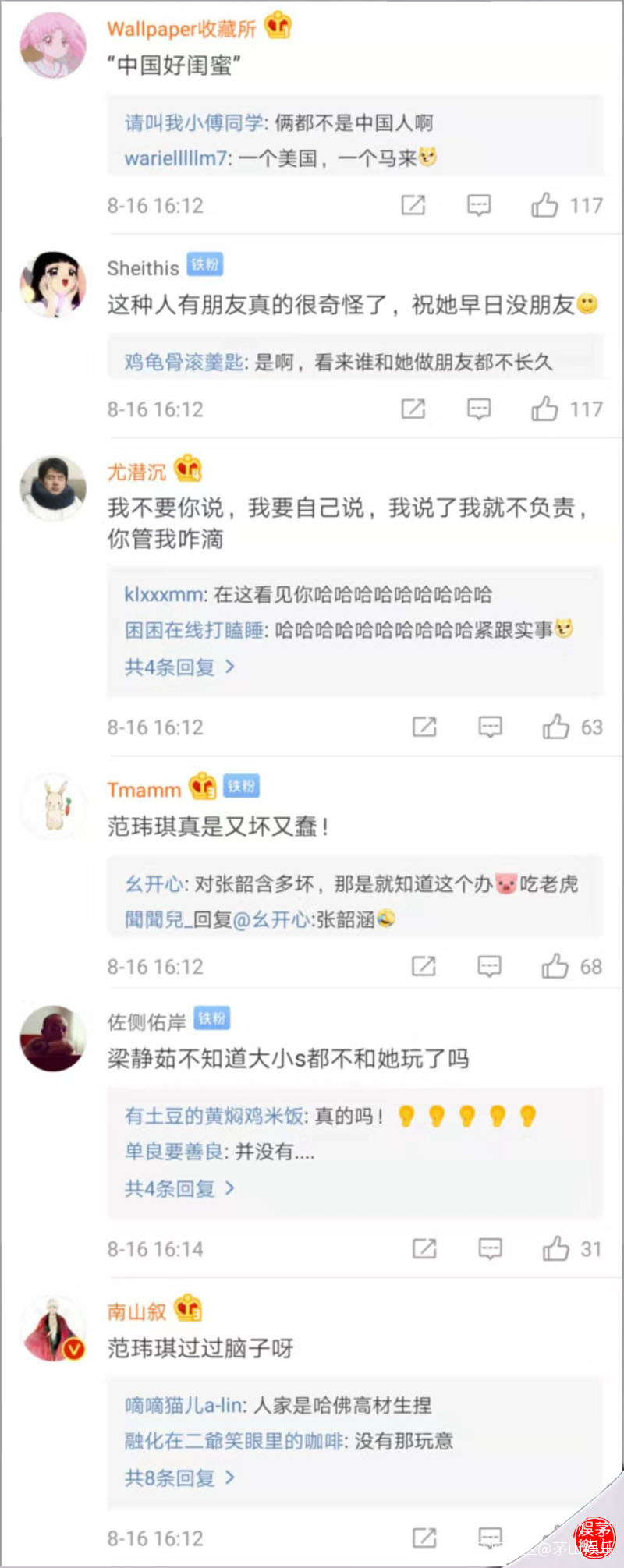 “中國好閨蜜”、“這種人有朋友真的很奇怪了,祝她早日沒朋友”、“是啊,看來誰和她做朋友都不長久”、“范瑋琪真是又壞又蠢!”、“對張韶含多壞,那是就知道這個扮豬吃老虎”、“梁靜茹不知道大小s都不和她玩了嗎”、“范瑋琪過過腦子呀”