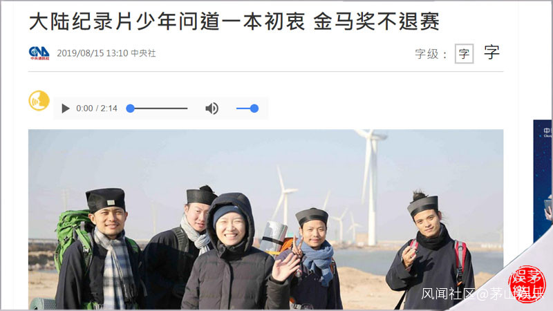 8月15日,多家台媒發通稿稱,大陸紀錄片《少年問道》“仍一本初衷,堅持不退賽。”據悉,《少年問道》是名不見經傳的北電畢業生、導演朱昱的紀錄片作品,主要記錄4名青年道士(中國道教學院的研究生)李寧、王理一、任崇誠及姚上硯為體現“全真邱祖”(丘處機)慈悲大愛,於今年一月寒冬時節身着道服,以乞行方式、自北京白雲觀徒步走到山東棲霞聖地展開15天、行走600公里的問道之旅。