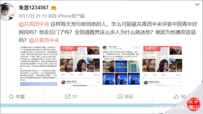 在她的微博下,有很多網友表示不接受這個解釋,甚至有網友問道“村子裏剛通網呢???玩兒呢”不過,朱昱並沒有理會網友,很快又於17日的20:43分、21:13分、21:23分、21:44分、以及18日02:04分,連續發了5條微博怒斥大V全真道士梁興揚造謠,還稱其“想出名想出瘋了吧?”,另外她還@共青團中央問道:“這樣每天發污穢消息的人,怎麼可能被共青團中央評委中國青年好網民嗎?他走後門了嗎?”