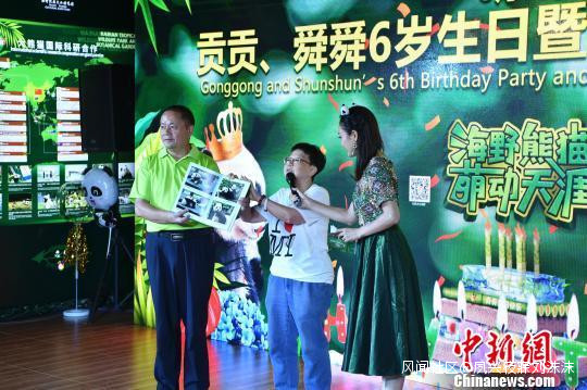 中新網海口8月18日電 (記者 張茜翼)來海南落户安居近9個月的大熊貓兄弟“貢貢”和“舜舜”,18日在海南熱帶野生動植物園迎來六週歲生日,這是它們在海南過的第一個生日,眾多“貓粉”前來慶生。