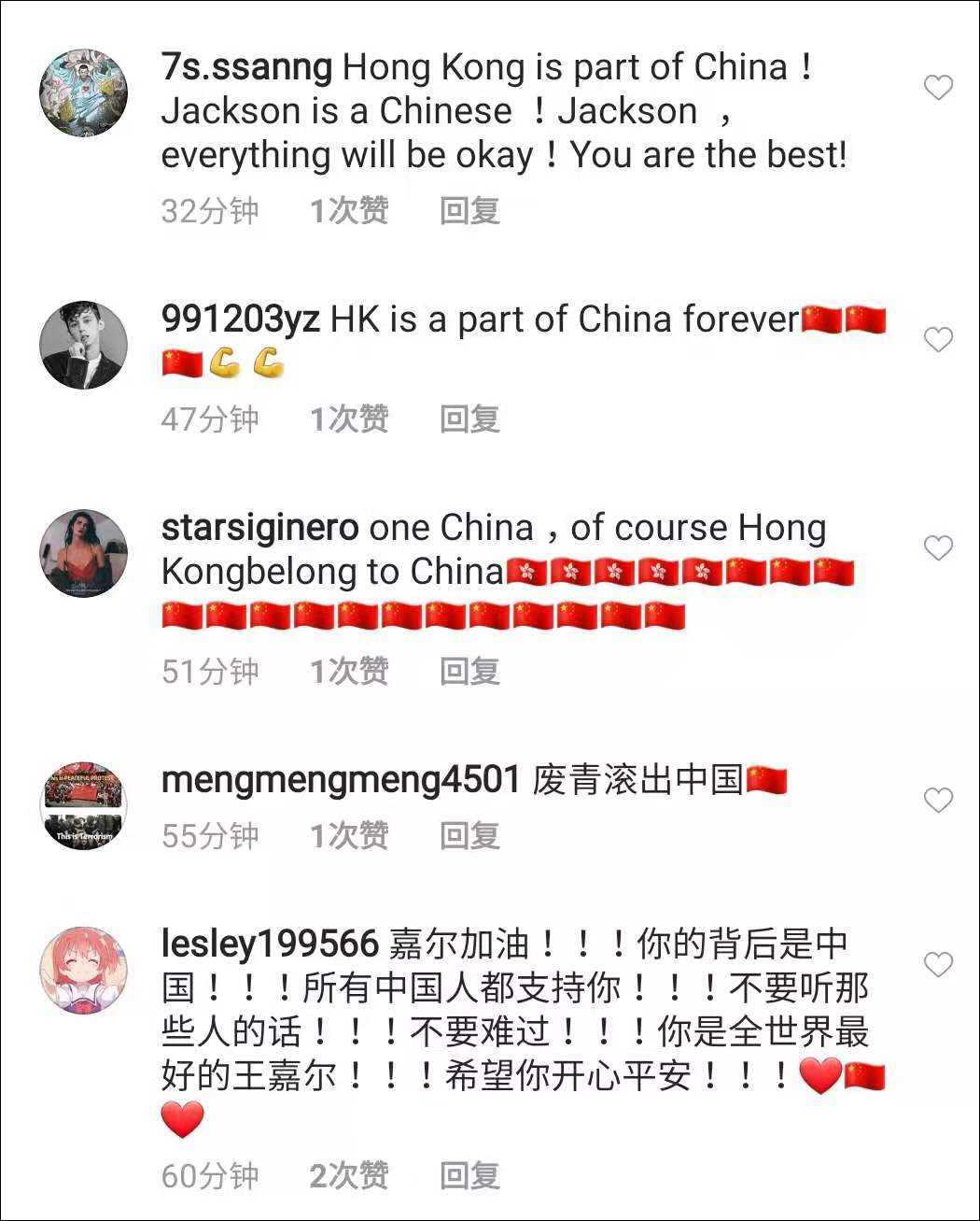 對於王嘉爾的支持當然不可能缺席,“飯圈女孩”們用發表一箇中國的言論,以及刷國旗、區旗的方式,成功將港毒廢青們惡毒的留言蓋過,取而代之的是一片紅色的海洋!