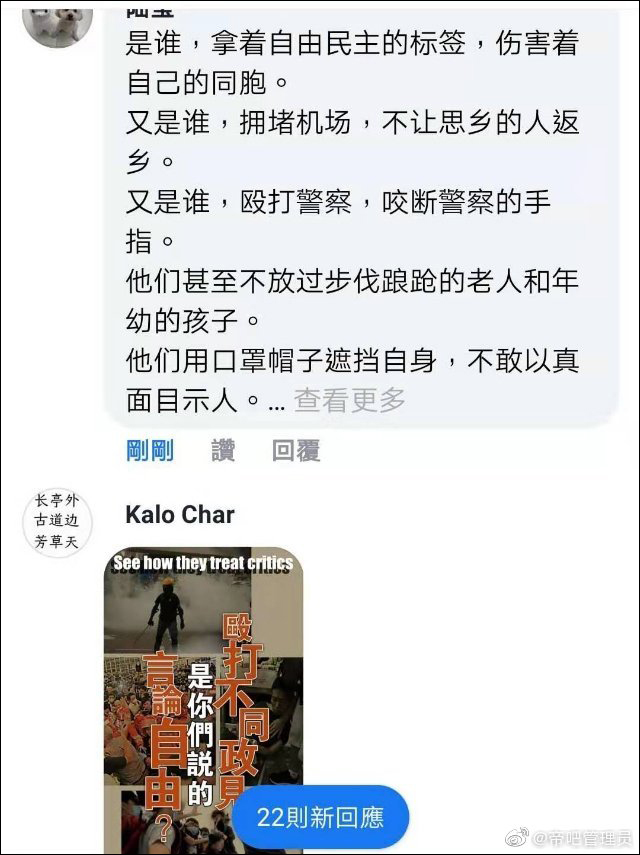 17日下午,@帝吧管理員 發表了慷慨激昂的“出征檄文”:“晴天被烏雲遮蔽,紫荊蒙上陰影,往日熙攘的街道充斥着黑衣暴亂者,温暖的藍色染上血污。七子之歌縈繞耳畔,百年屈辱好似要重現眼前。”