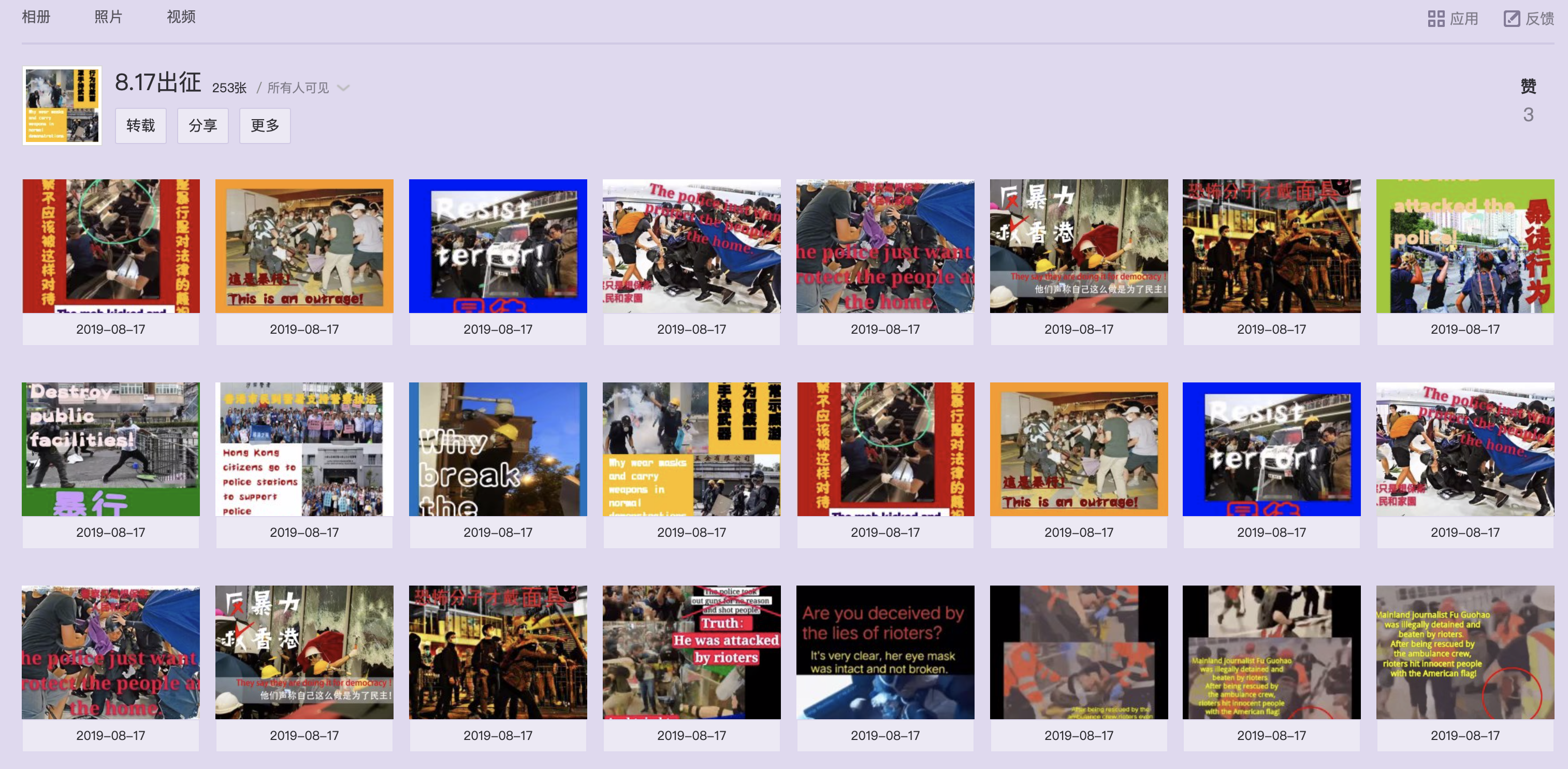 與此同時,帝吧網友們就建立了大量的“阿中後援團”來統一指揮調度,通過QQ羣、QQ空間、微博等平台發佈了“作戰彈藥”,包括中英文評論、表情包、海報、國外警察處理激進示威者現場照等物料。