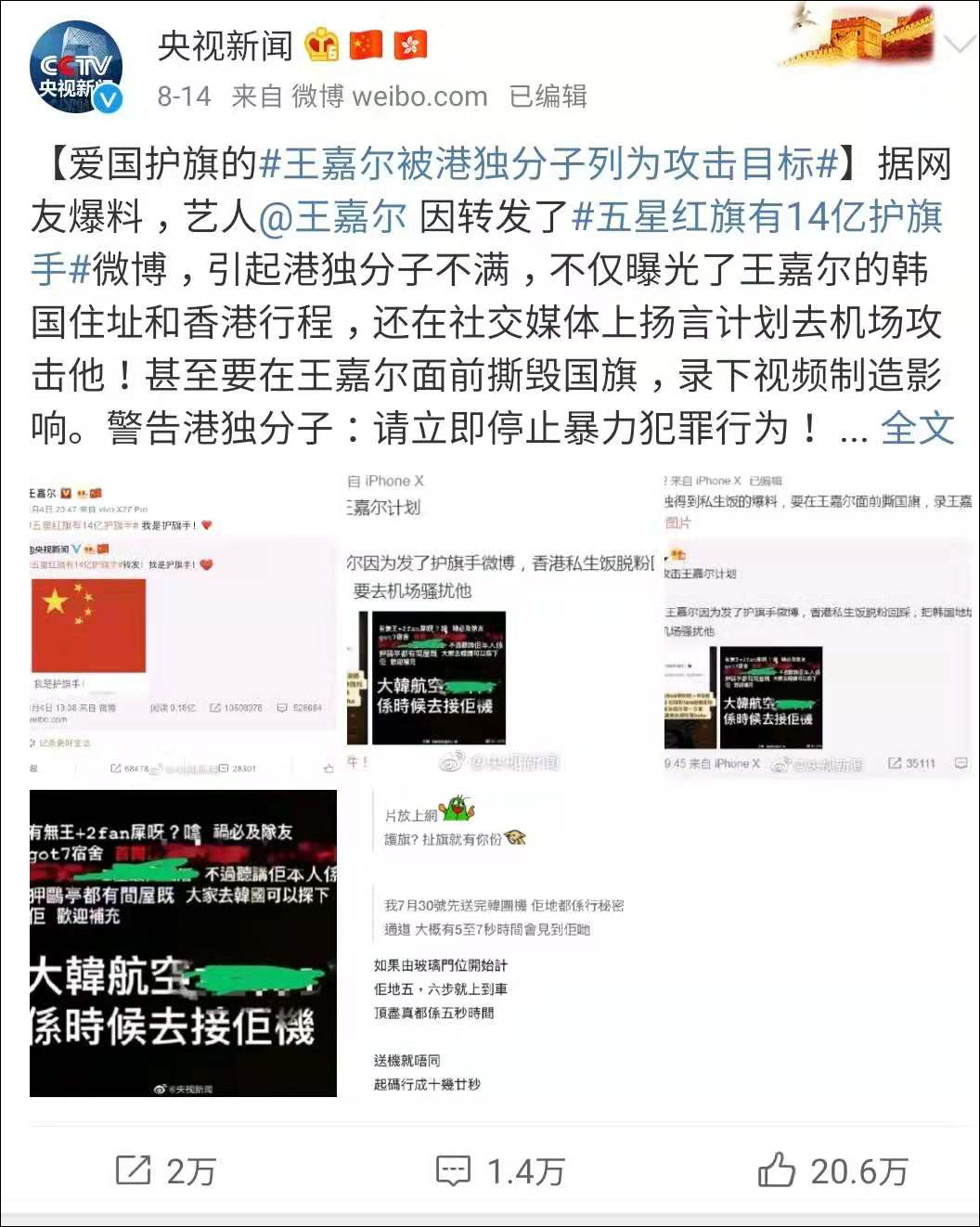 此前香港藝人王嘉爾因轉發了五星紅旗有14億護旗手微博,引起“港獨”分子不滿,不僅曝光了王嘉爾的韓國住址和香港行程,還在社交媒體上揚言計劃去機場攻擊他!