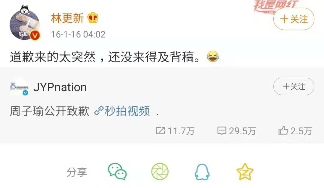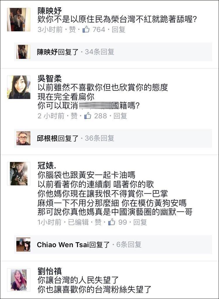 在此之前,大陸演員林更新因為發佈微博調侃周子瑜“道歉太突然,沒來得及背稿”,引起台獨分子的不滿,不斷地在林更新Facebook頁面下留言謾罵。
