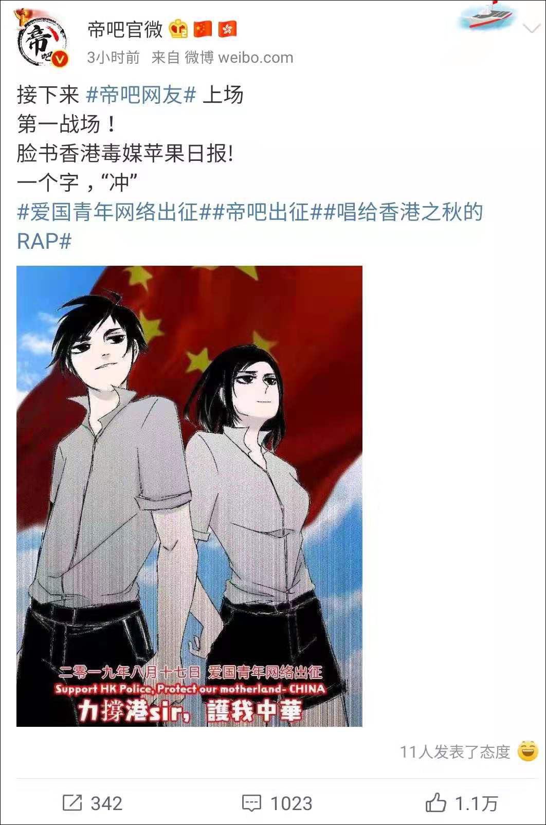 面對港毒分子襲擊警察、癱瘓機場、衝擊立法會、侮辱國徽國旗、毆打平民等一系列暴力行為,帝吧網友喊出“止暴制亂”“恢復秩序”“嚴懲暴徒”“打擊違法”“公正報道”五大訴求,聯合其他愛國組織形成愛國統一戰線,站出來共同發聲,聲援海內外同胞。