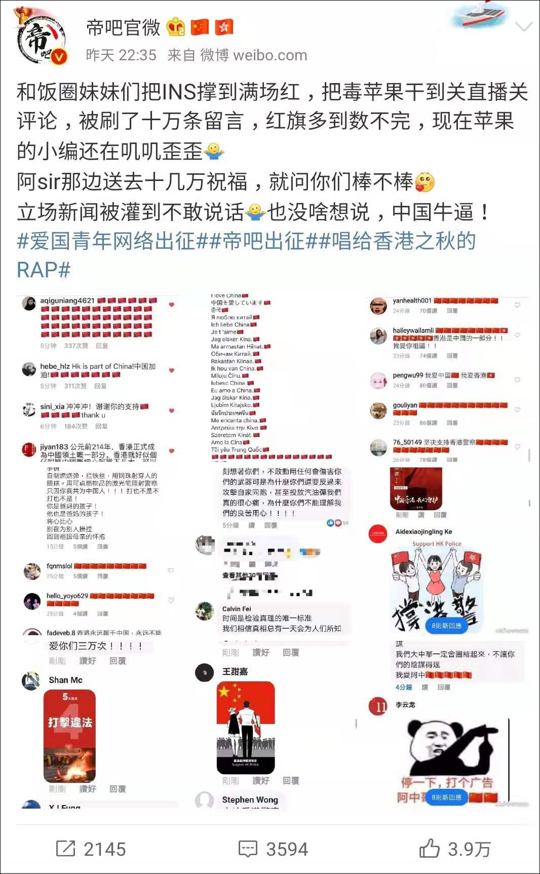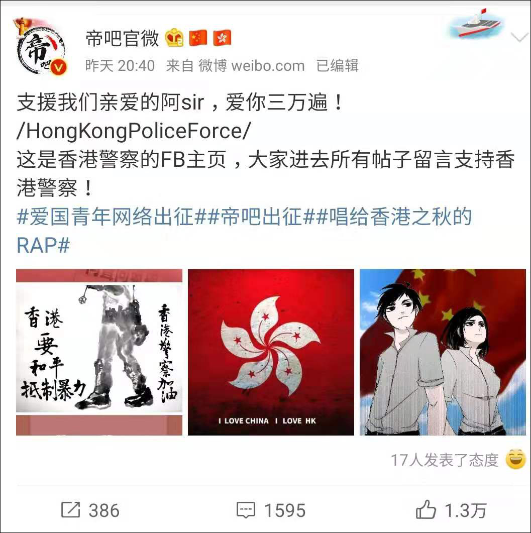 除了踩爆香港毒媒外,本次出征最重要的一件事就是支持香港警察!在@帝吧官微 的指揮下,大量網友前往香港警察的Facebook主頁支持香港警察。