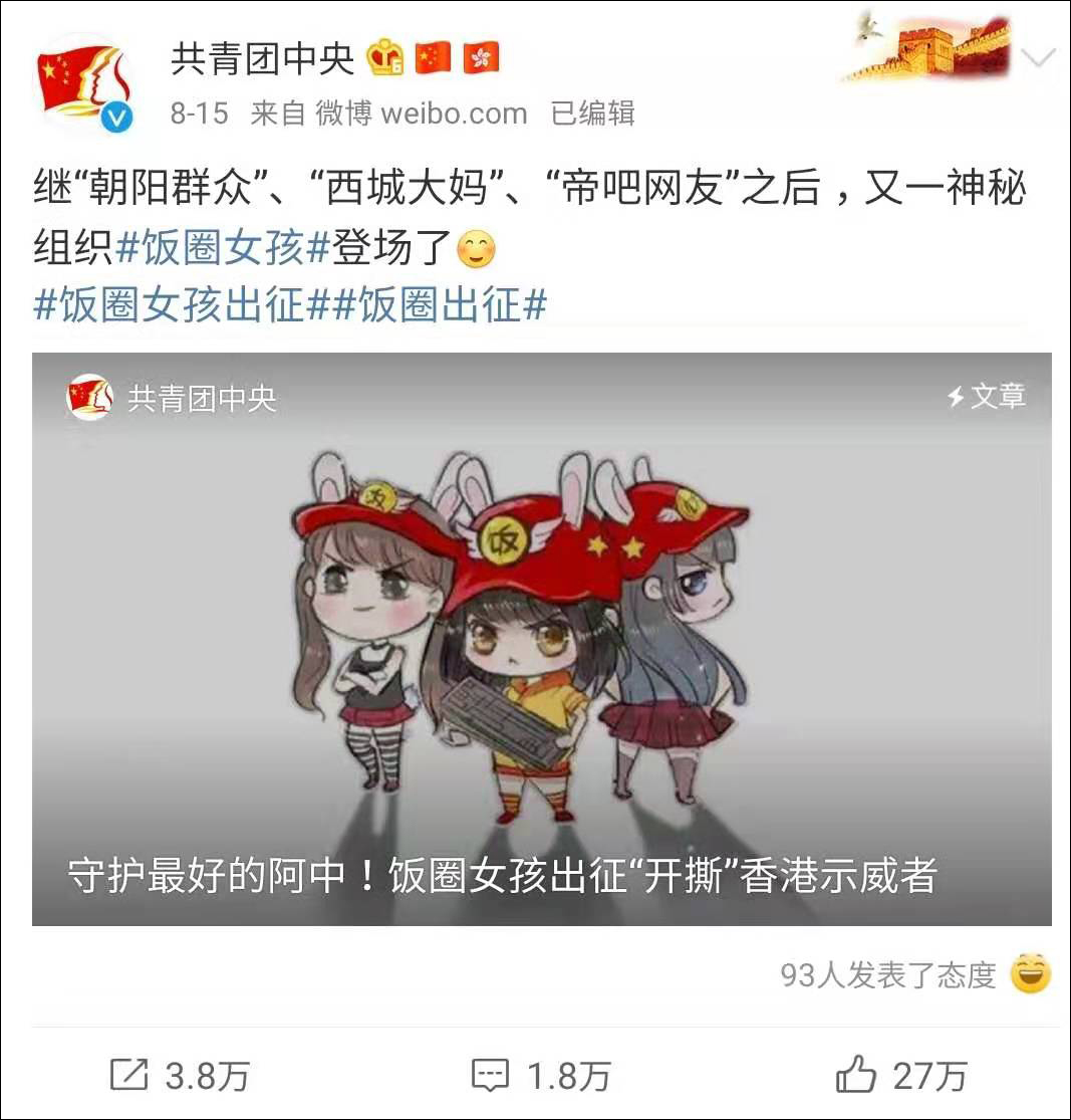8月15日,@共青團中央 發博宣佈,繼“朝陽羣眾”、“西城大媽”、“帝吧網友”之後,又一神秘組織“飯圈女孩”登場了。