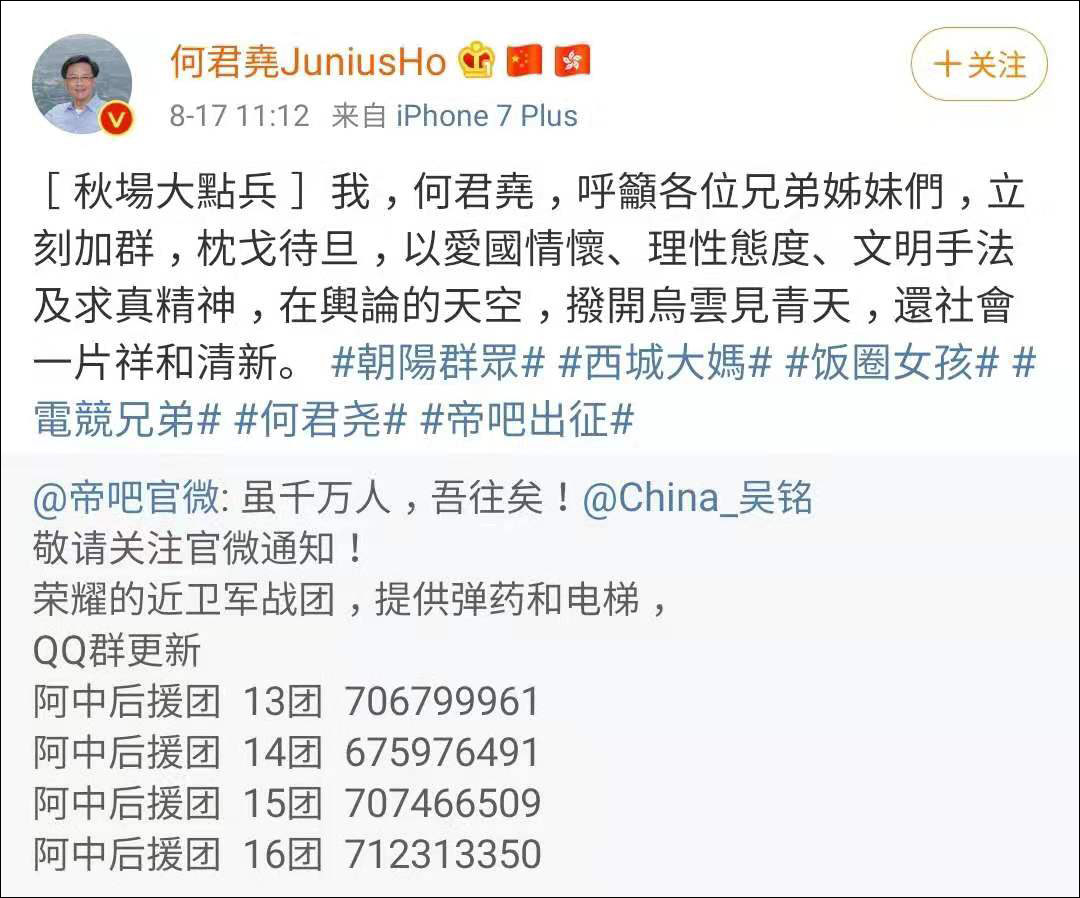 在帝吧出征前,被港毒們砸了祖墳和辦事處的香港立法會議員何君堯,還在微博上為出征的網友們加油打氣!