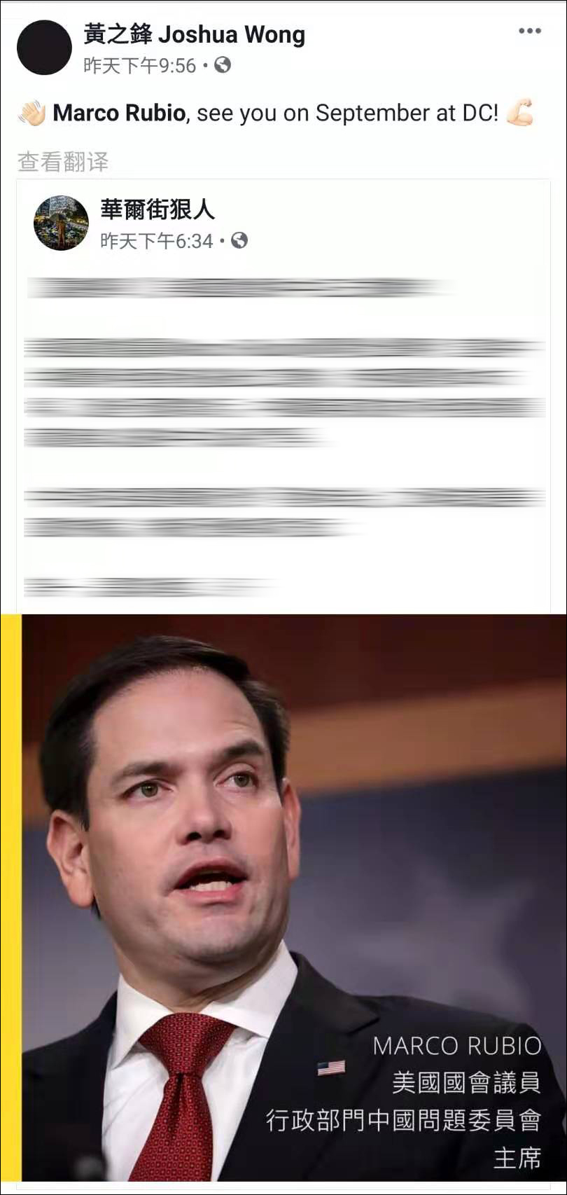 就在出徵網友抵達戰場時,黃之鋒還在自己Facebook主頁上發了一篇跪舔美國的帖子。