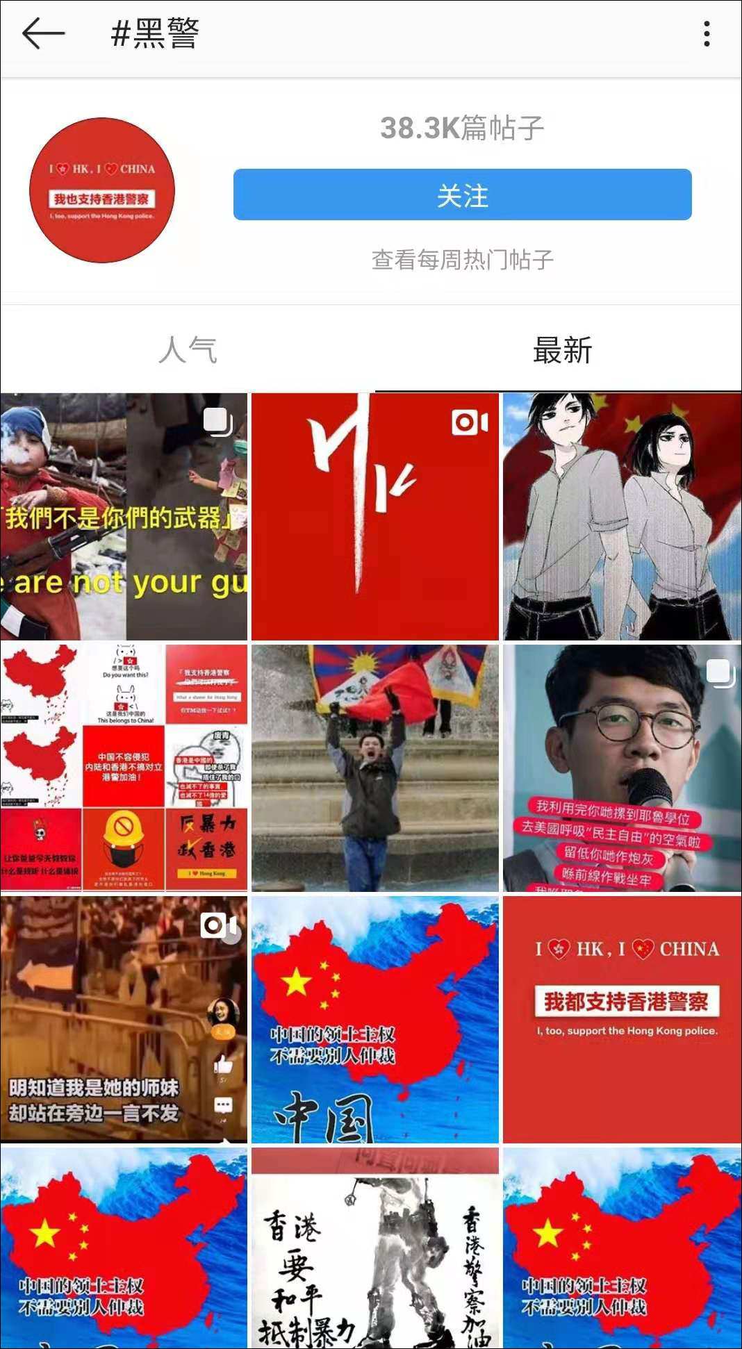 為了維護勝利的果實,出征的網友們團結一致,發佈了大量“愛國”“撐警”的內容。“黑警”話題一時滿屏紅色!與之前充滿暗黑圖片的頁面形成了鮮明的對比!