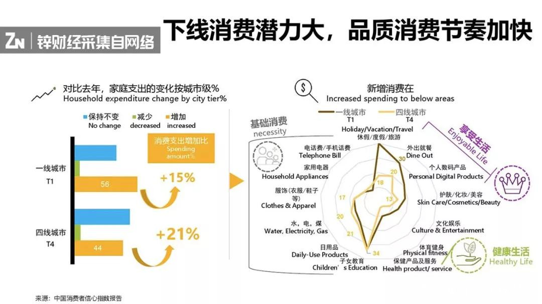 實際上,從收入絕對值上,低線級城市用户的收入的確不及一、二線城市用户,然而,房價、小孩教育支出等相對更低的生活成本,讓下沉市場人羣擁有相對較高的可購物支出。同時,物流的便利提供了更加豐富的商品選擇,網絡的普及創造了更高的信息透明度,下沉市場在品牌、品質方面的認知度和一、二線城市的消費者正在日趨接近。對於以張松、榮軍為代表的這羣信息透明度較高、可購物支出較多的這羣下沉市場用户,京東將之定義為“隱形新中產”。