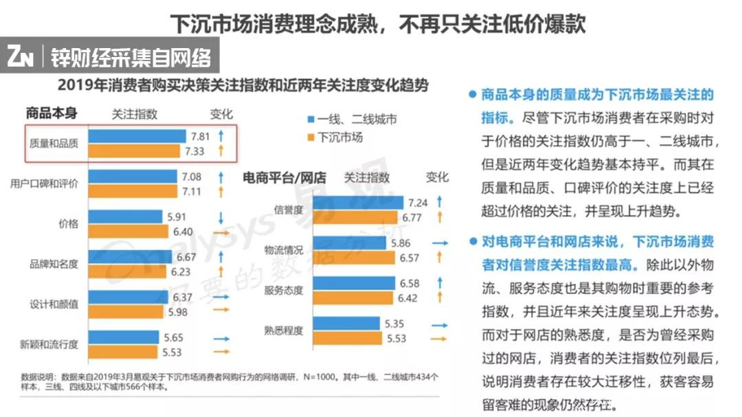 《下沉市場消費者網購趨勢洞察2019》中提到,商品本身的品質成為下沉市場最關注的指標。相比一二線城市,下沉市場消費者在採購時,對於價格的關注指數在近兩年變化趨勢基本持平。而其在質量和品質、口碑評價上的關注度已經超過了價格的關注,呈現上升趨勢。