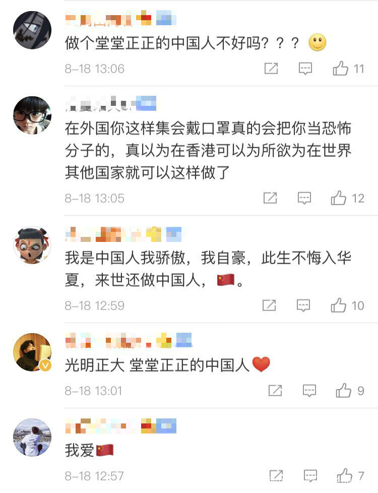 在世界上很多國家都有實行“禁蒙面法”,顧名思義就是以立法形式及施加刑責,禁止有人在特定場合遮蓋臉部,美國多州、加拿大以及德國等地都有實施,且不少國家都可以對被定罪者處以監禁刑罰,部分國家則會以罰款形式處理。這些極端示威者蒙面集會的行為已經觸犯了他國法律。在澳大利亞的墨爾本、加拿大的温哥華、英國的愛丁堡等地,愛國華人強烈要求亂港分子“摘口罩”。網友們看到這些視頻,也紛紛在評論區留言表示支持。