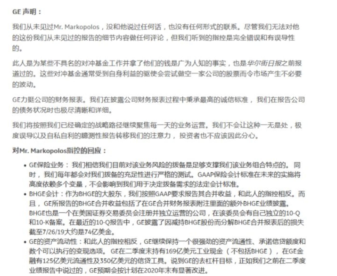 馬科波洛斯還表示,通用電氣會計欺詐已有“悠久的歷史”,最早可以追溯到1995年。他還專門建立了一個網站,給投資者和公眾查閲這份報告。 消息一出便震驚了業內,通用電氣更是市值大跌。