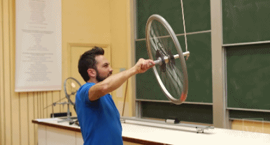 上圖左下角的陀螺儀沒有旋轉時,一鬆手就掉了;而當它高速旋轉時,產生的角動量甚至能讓它戰勝重力的影響,繼續掛在繩子上旋轉。