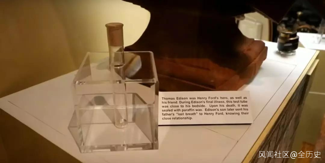 1931年10月,愛迪生臨終前,在牀邊擺放着很多試管。他在每個試管中吹出一口氣後,要求醫生用石蠟封閉,並將其中一個送給了亨利福特。這就是福特博物館裏那根試管的來歷。