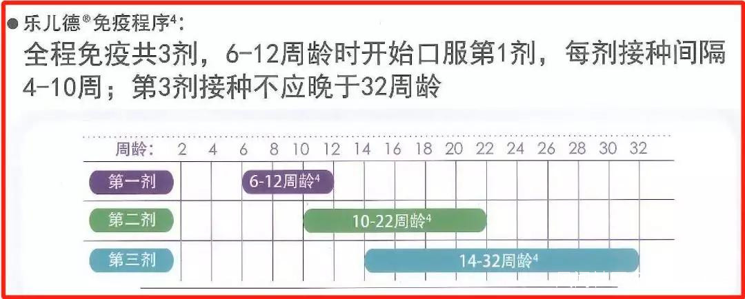 我們再來看看,羅特威的生產企業(蘭州生物)所屬的中國生物製品集團,在羅特威宣傳彩頁裏也這樣説——2月齡~3歲兒童,每年服用1次,全程3劑次。2月齡、14月齡、26月齡,一共3劑。