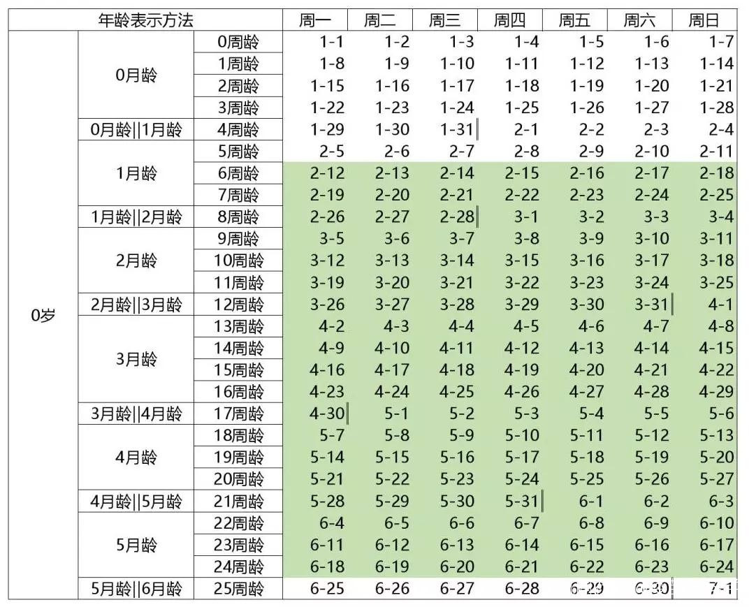 淺綠色底紋的單元格就是這個孩子可以服用樂兒德的全部日期範圍,即從2月12日滿6周齡開始,直到6月24日(24周齡的最後1天)。