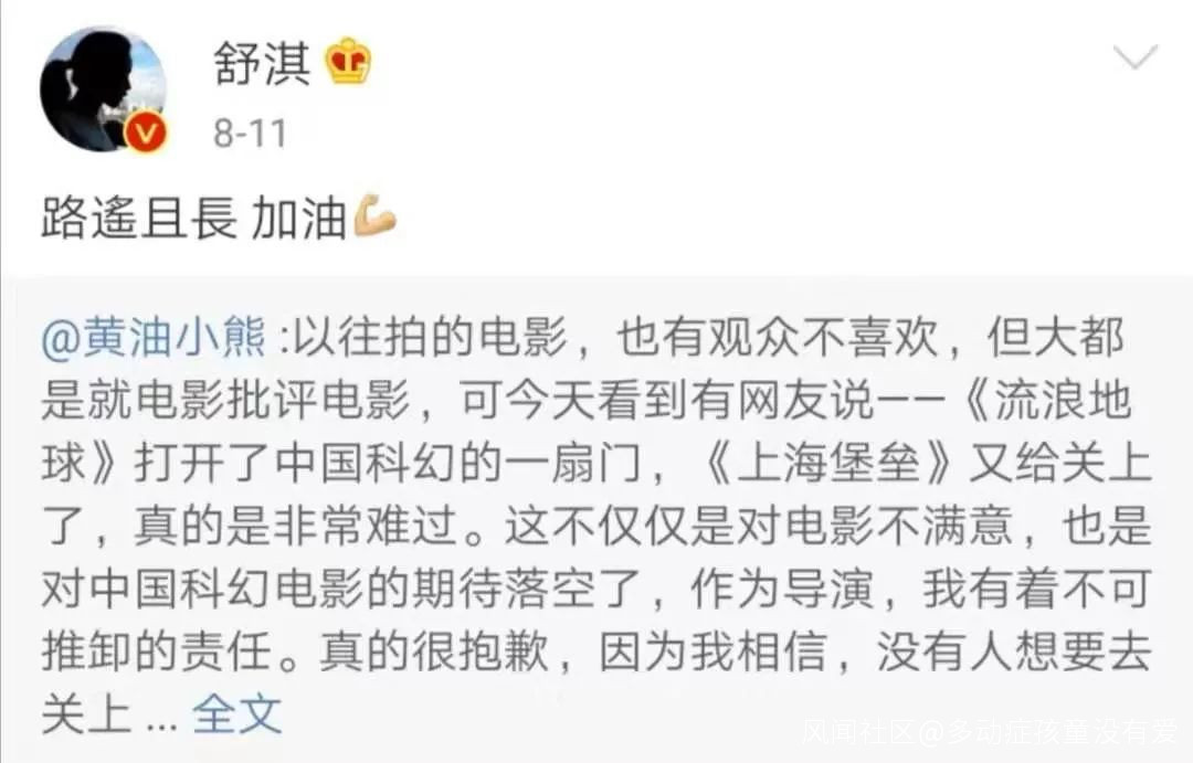 這個事,我發了一個道歉的微博,**但我不覺得中國科幻電影的未來會靠一部電影成了,也不會靠一部失敗了,**更不是一幫在旁邊起鬨的,説關門就關門。